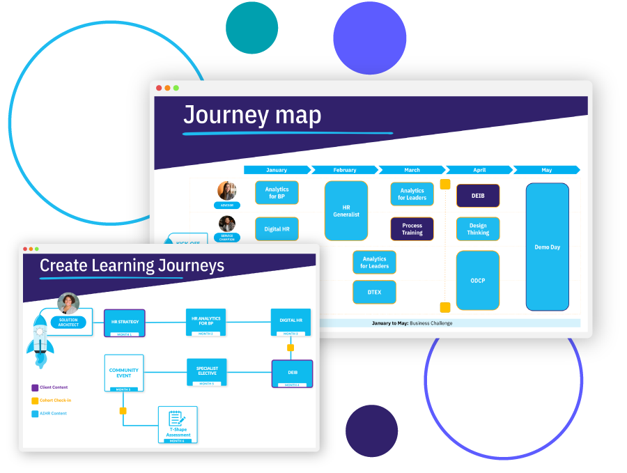 After performing a skills gap analysis between the desired personas and the existing HR population, we will build learning journeys that show exactly how people will be trained to develop the required competencies.
