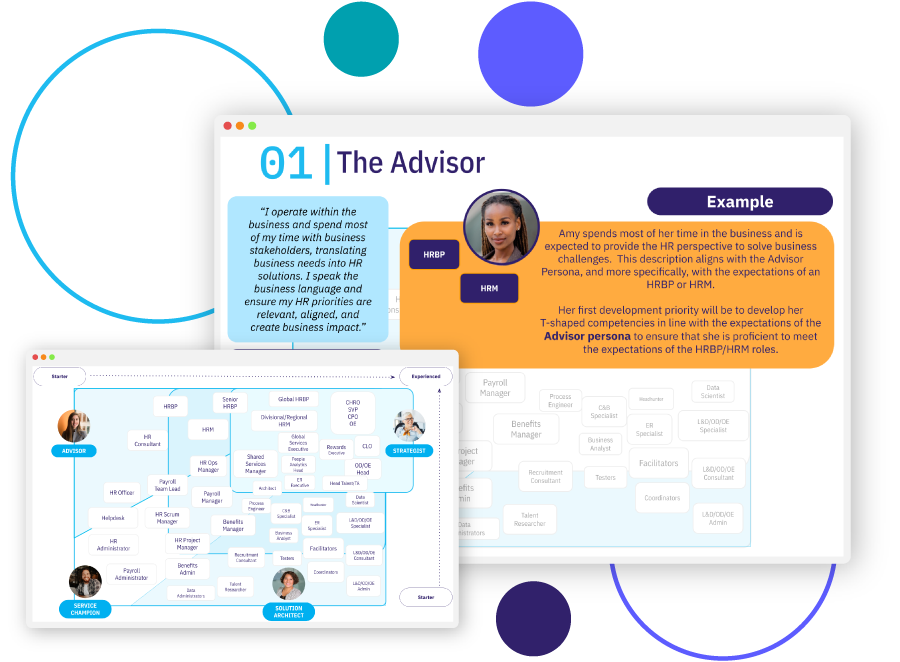 The individual competencies defined in the capability model will be translated into 3 – 6 desired HR personas. Each persona represents various HR roles that require a similar skill set.
