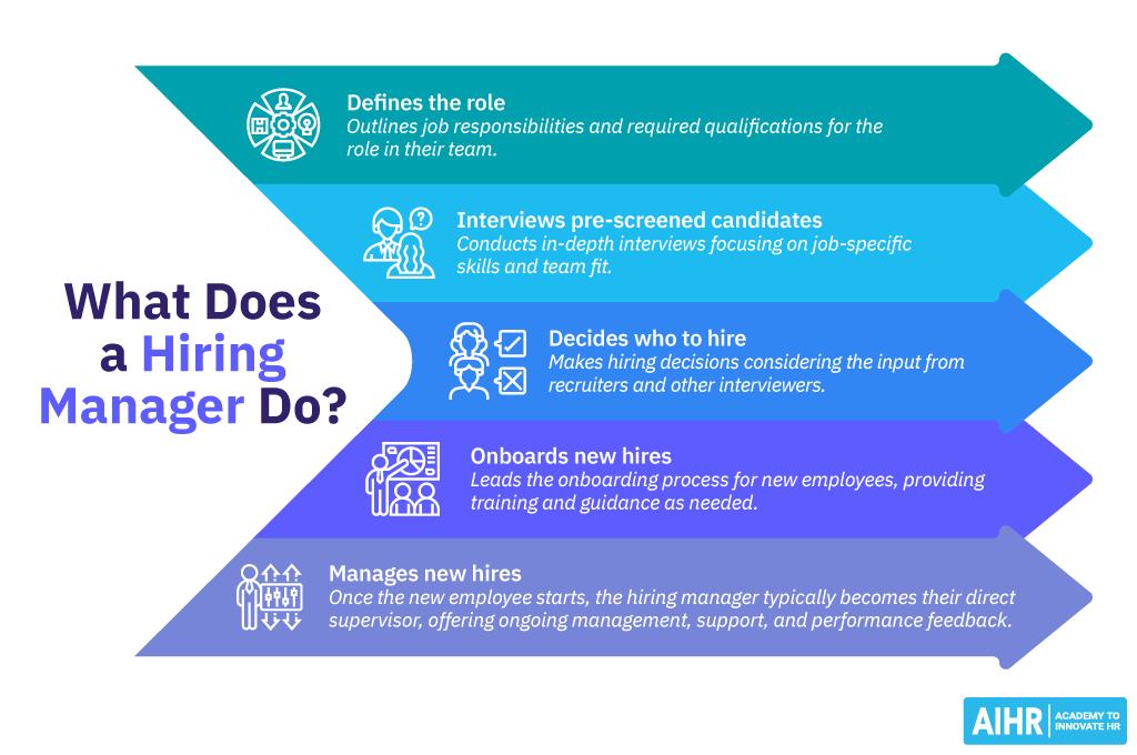 - The hiring manager is the future manager of the new hire. They initiate the hiring process, and interview, select, and onboard new employees. They are the final decision-maker and get to say who gets hired and who doesn’t. Hiring is just one part of their job of leading a team.