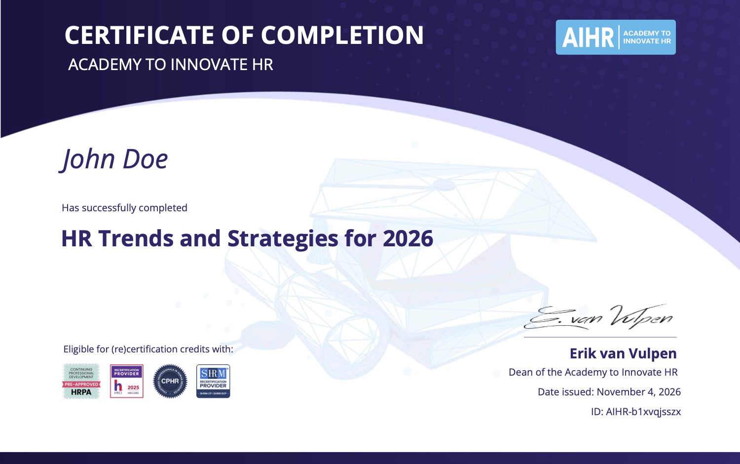 • Stay up-to-date with latest trends Get instant recognition with a globally recognized certification from AIHR.