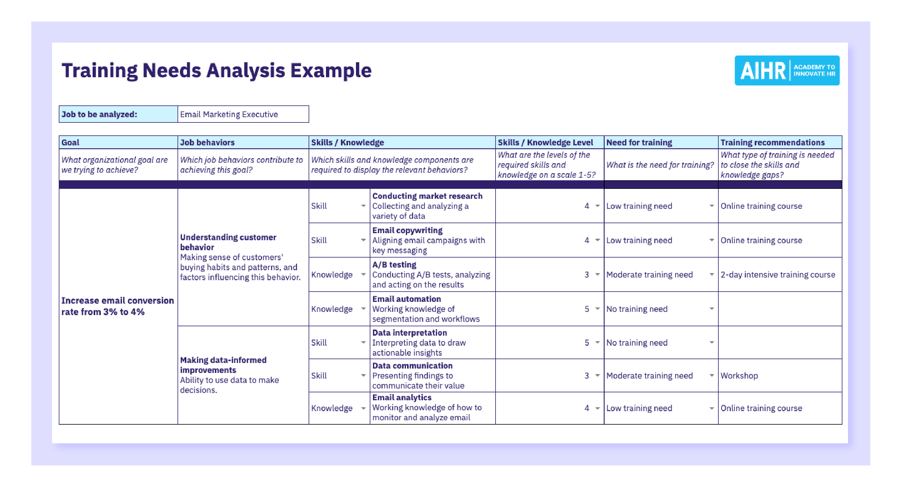 Let’s have a look at a practical training needs analysis example for a specific role – Email Marketing Executive.