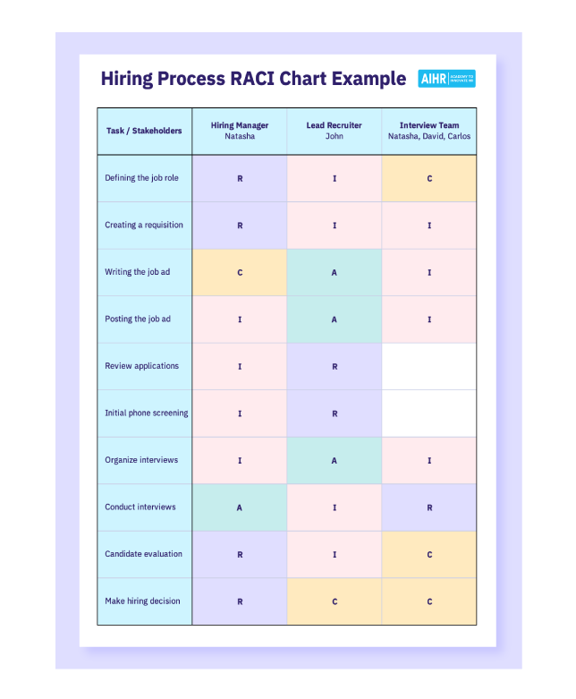 You can create a RACI matrix (Responsible – Accountable – Consulted – Informed) outlining the tasks to be carried out during the recruitment process, which can be helpful as a reference point for everyone involved. Here’s an example of what it could look like: