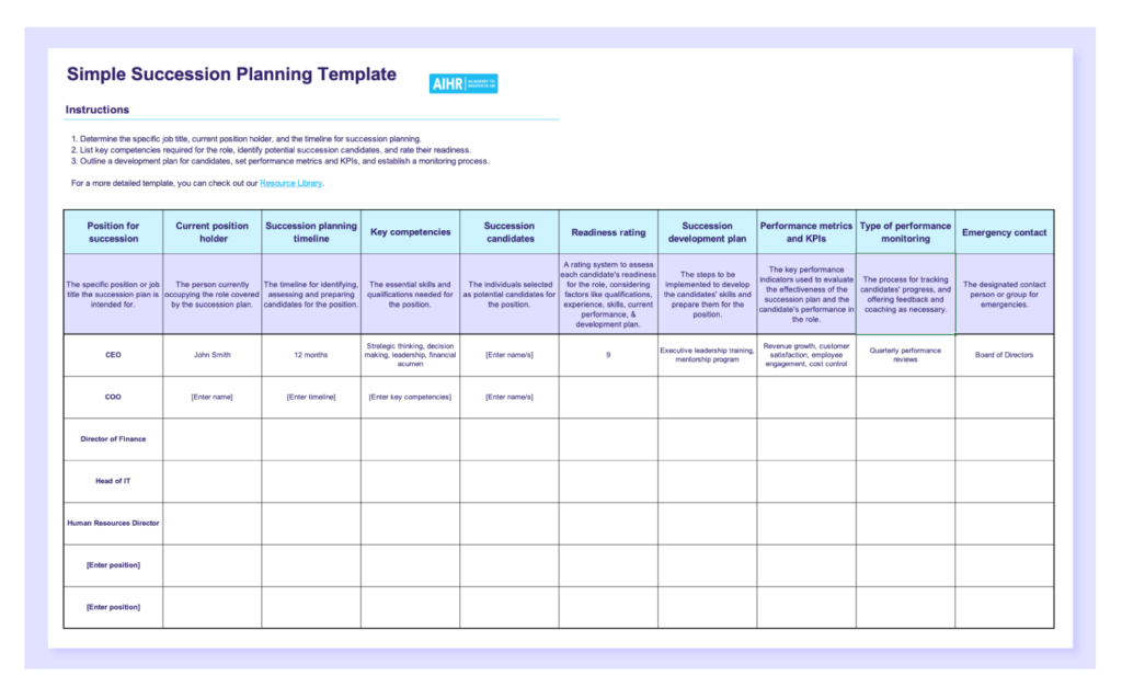 - Use a succession planning template to streamline the process, as templates provide a structured format that can be customized to fit your organization’s needs