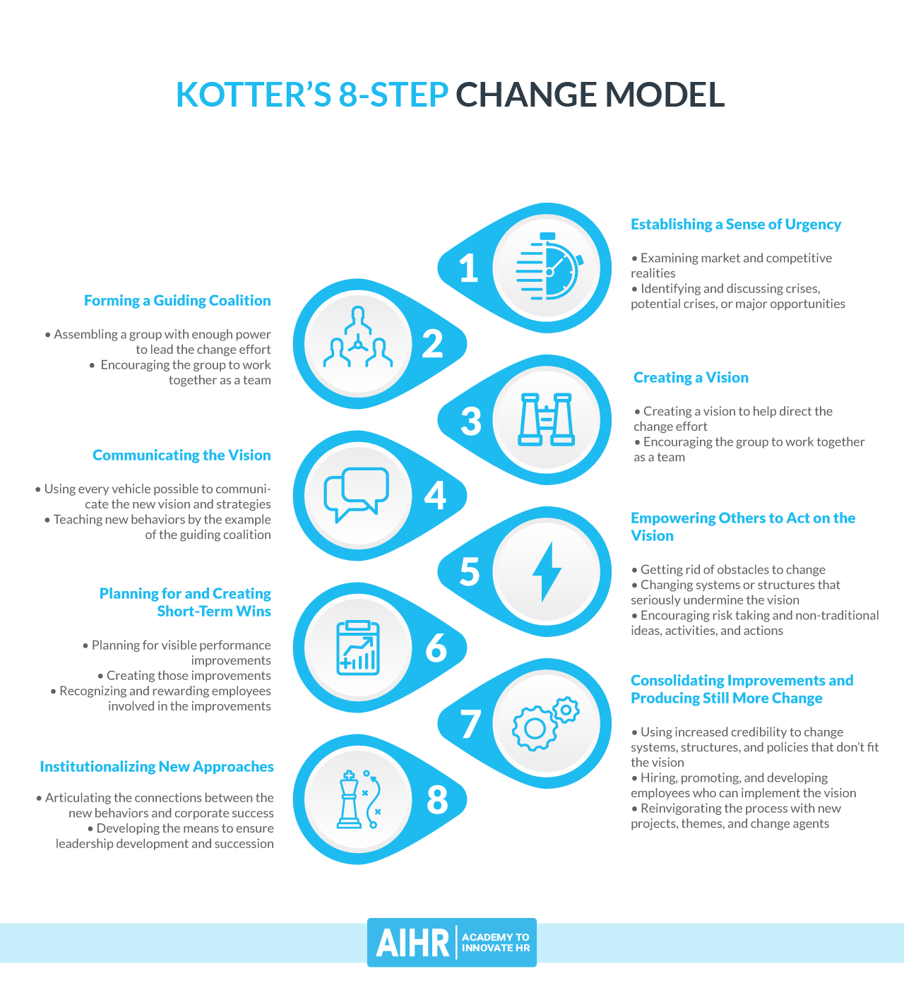 Perhaps you get to step six of creating short-term wins only to find that the vision was incomplete or that you need different stakeholders in your guiding coalition. At that point, you cycle back to these earlier steps and start again.