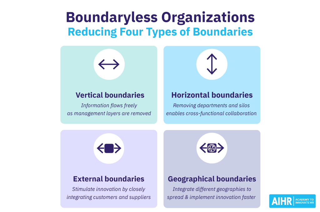 A boundaryless organization reduces four types of boundaries. Reducing boundaries for each dimension is one of the key characteristics of a boundaryless organization.