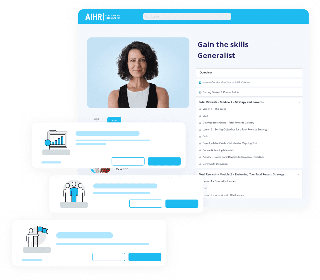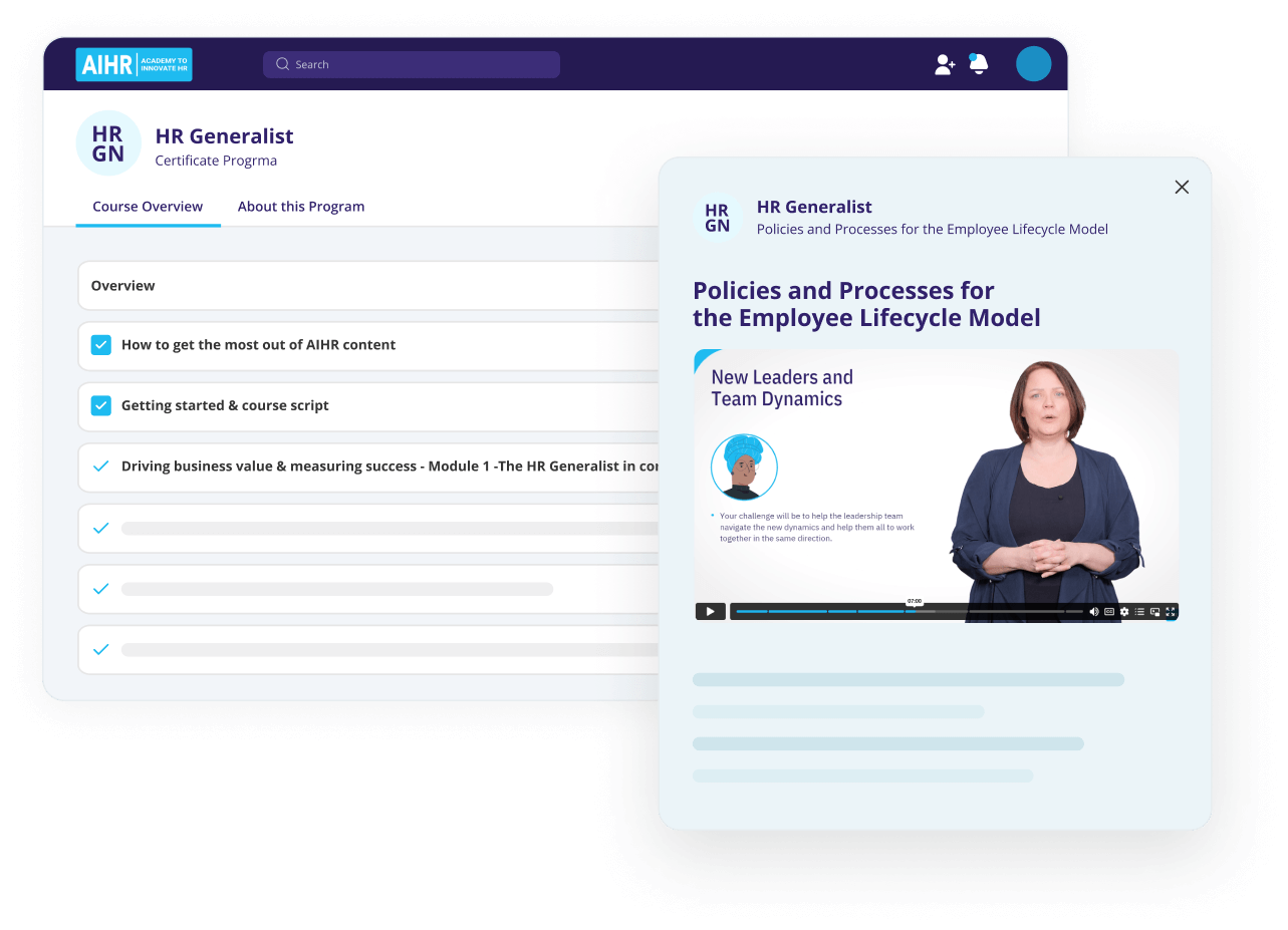 Trained on AIHR’s 1000+ articles, 500+ hours of video lessons, and 100+ downloadable resources, the AIHR Copilot puts reliable HR answers at your fingertips. Get quick answers, expert advice, practical resources, and actionable material to get the job done.